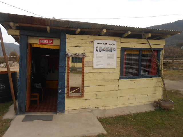 I usually never leave a place without trying its traditional costumes & as luck would have it, Aacho informed that by the Paro Chu (Paro River), there indeed was a place where tourists could get photographed in traditional habits. I, escorted by Aacho, rushed to this place. There, by the gushing river, a few people had already gathered. A senior Bengali woman was ready in her raiment. Inside a log-hut were a dozen traditional liveries hung in neat rows. I selected one & got myself clicked.