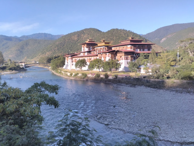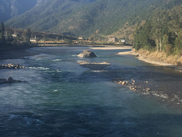 The impressive Dzong stood unperturbed & the sparkling river flowed its course unmindful of human intrusion, if any. The few, who trod, tiptoed without much ado, but not without wearing their Apollonian smiles. The monks, who strode, flashed theirs prophetically to mean that all was well with the world. The only sounds that suffused this riverine hamlet were the susurrant sounds of the sparkling stream.